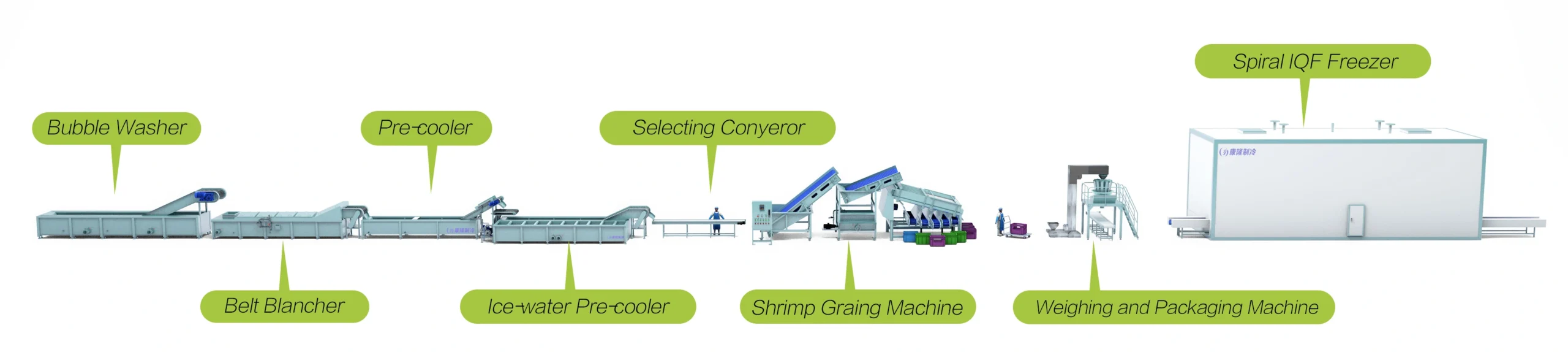 - Automated Discharge: These accurately graded prawns are collected by multiple conveyors, ready for immediate packaging or further processing in an IQF freezer.